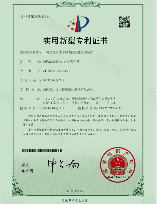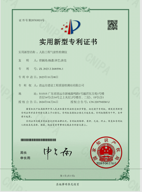 近日,由清遠(yuǎn)市建設(shè)工程質(zhì)量檢測(cè)站有限公司(下稱“市建工質(zhì)檢站公司”)研發(fā)的《一種建筑主體結(jié)構(gòu)表面硬度檢測(cè)裝置》和《人防工程氣密性檢測(cè)儀》獲國(guó)家知識(shí)產(chǎn)權(quán)局頒發(fā)的實(shí)用新型專利證書(shū),標(biāo)志著市建工質(zhì)檢站公司工程技術(shù)研發(fā)能力取得又一重大突破。